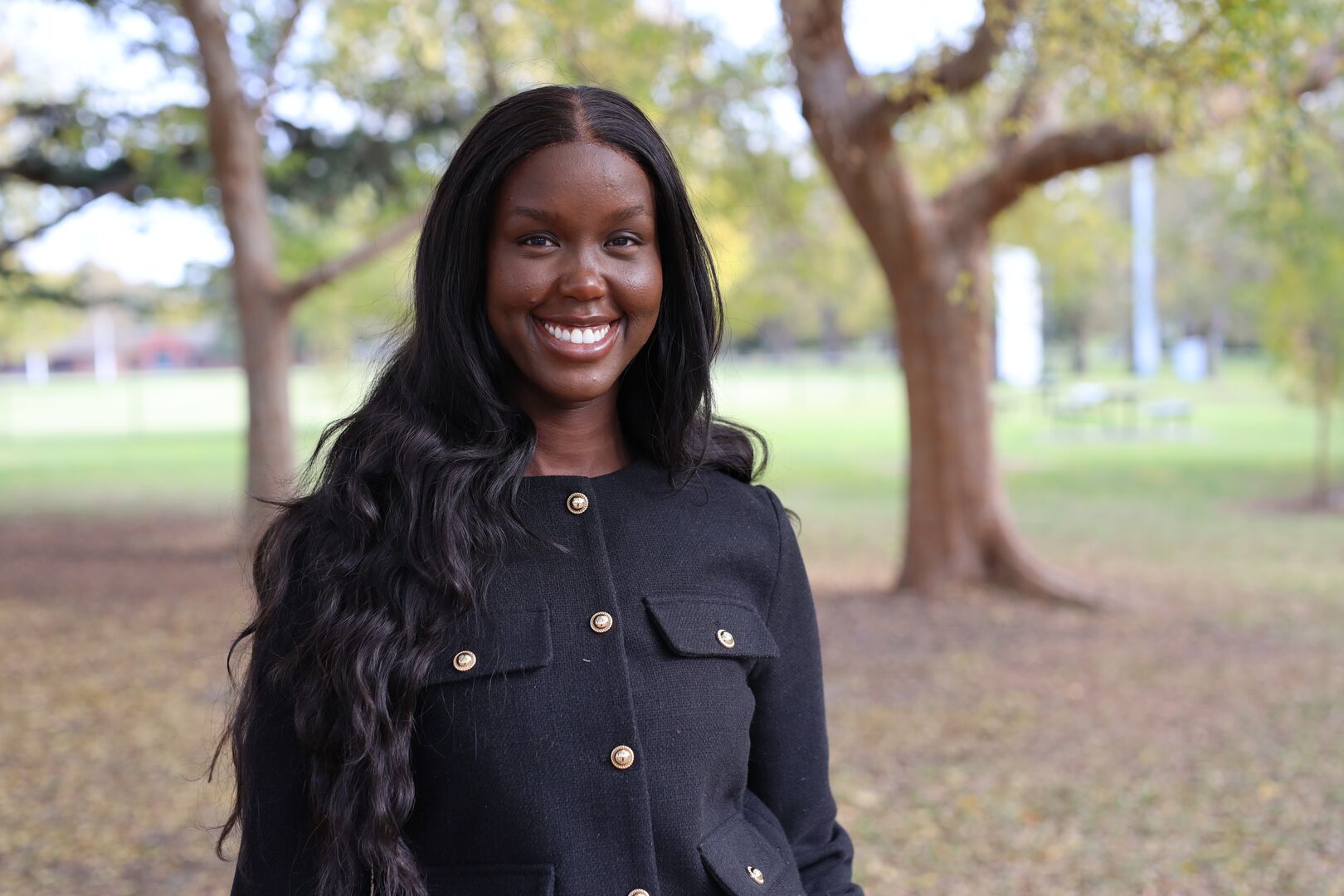 Paraman Tot is photographed standing in a park, wearing a navy jacket