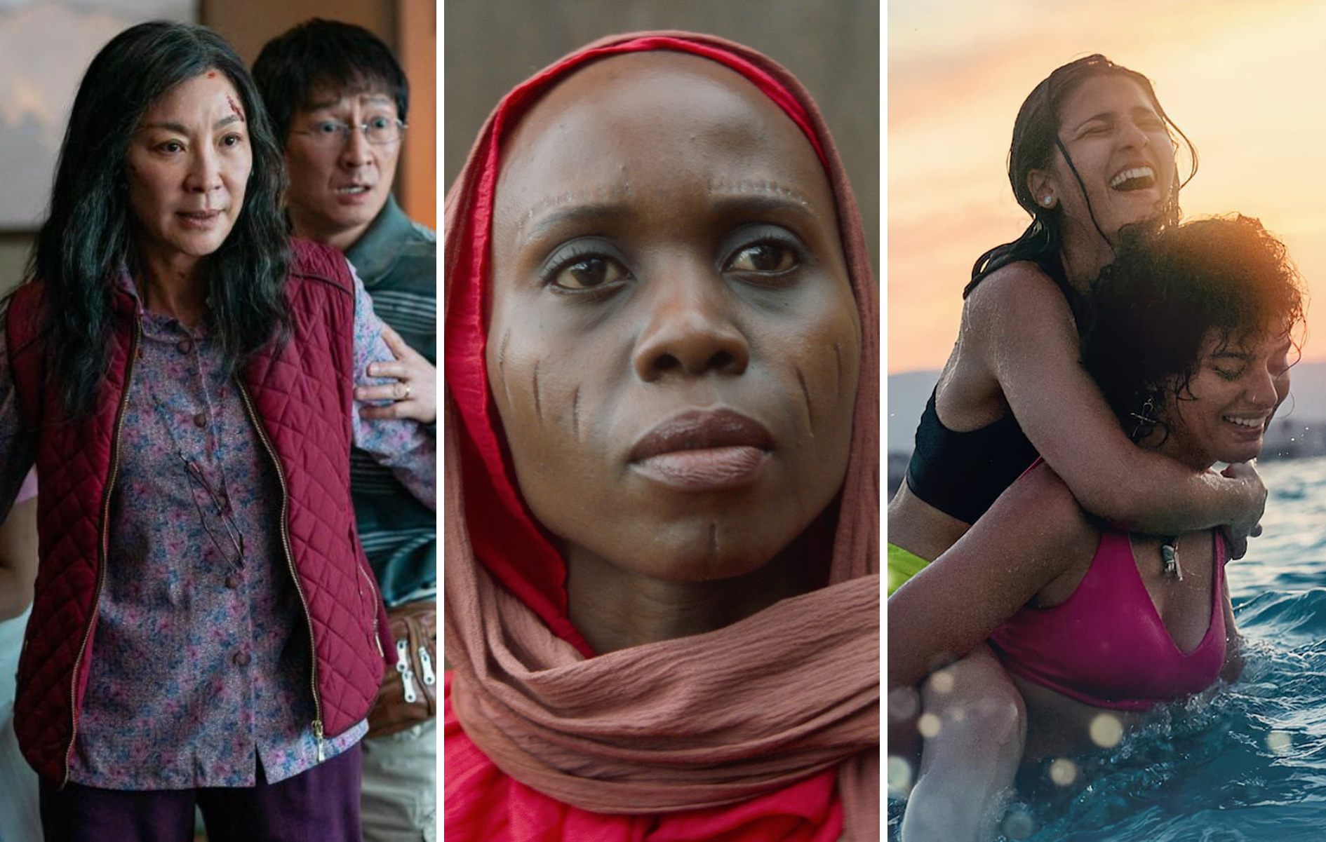 L-R: Stills from Everything Everywhere All at Once © IAC Films/A24, Bazigaga © Full Dawa Films/Kibibi Productions, and The Swimmers © Netflix.